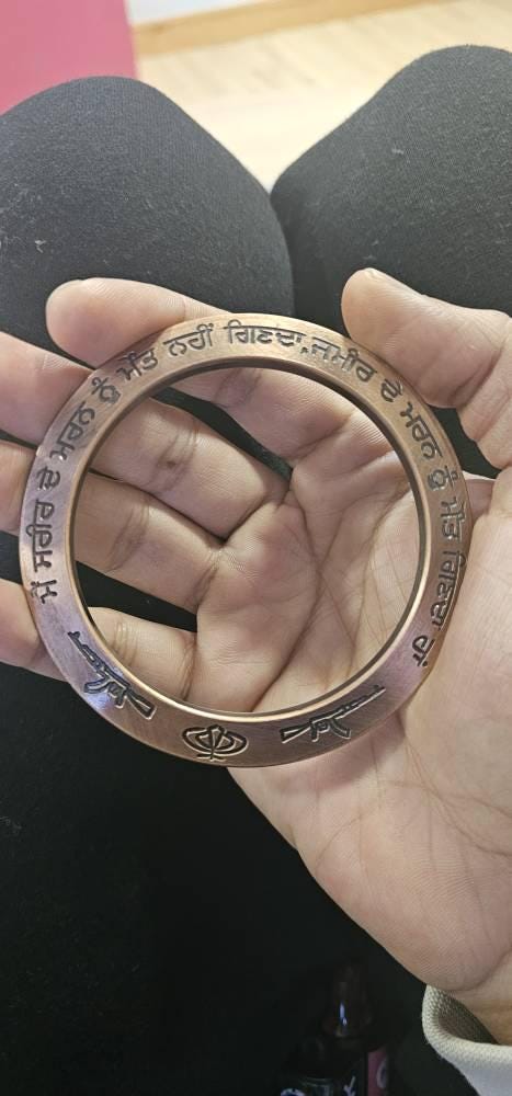 Beautiful engraved kada Sant ji`s slogan on one side and punjabi letters on the other side. It is medium thickness. It is Copper coated.